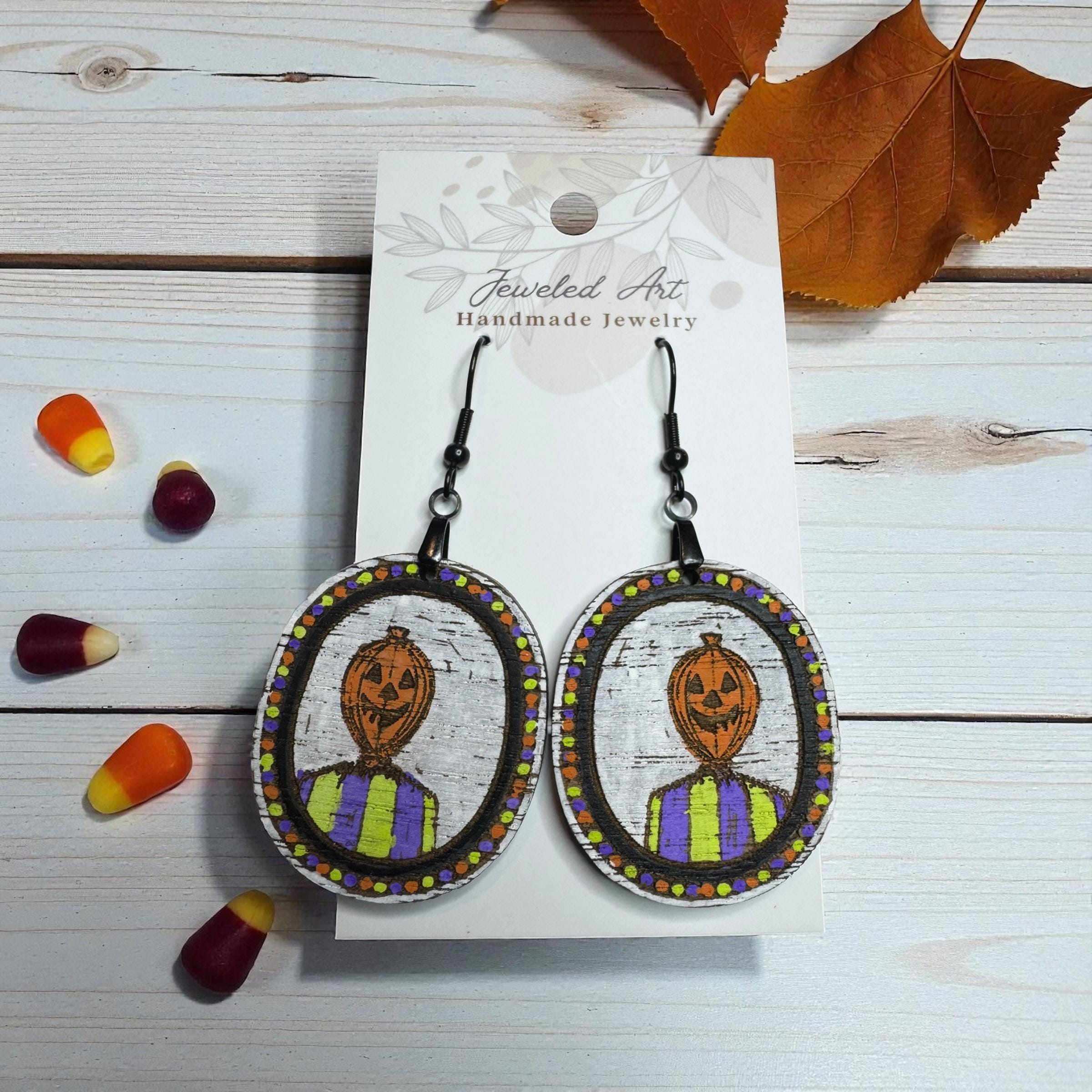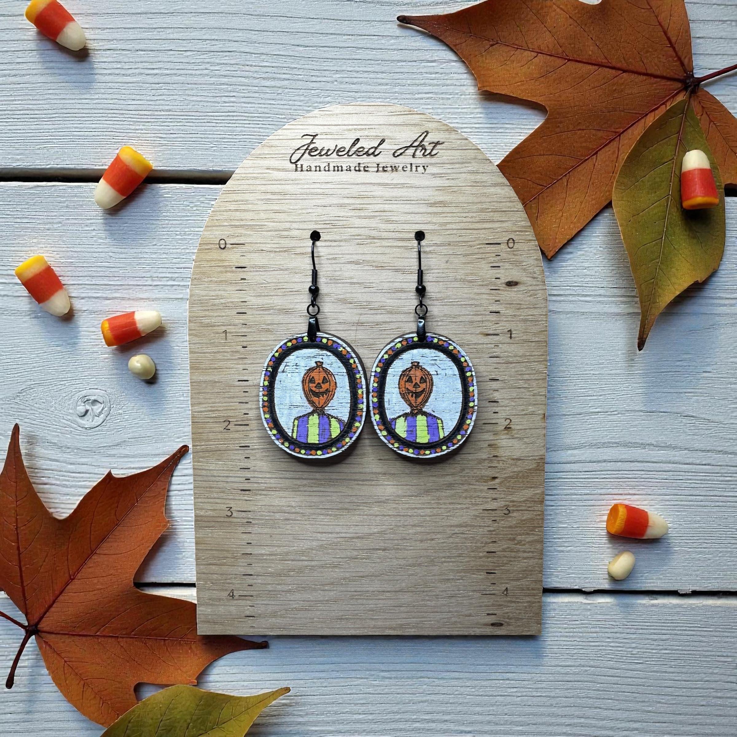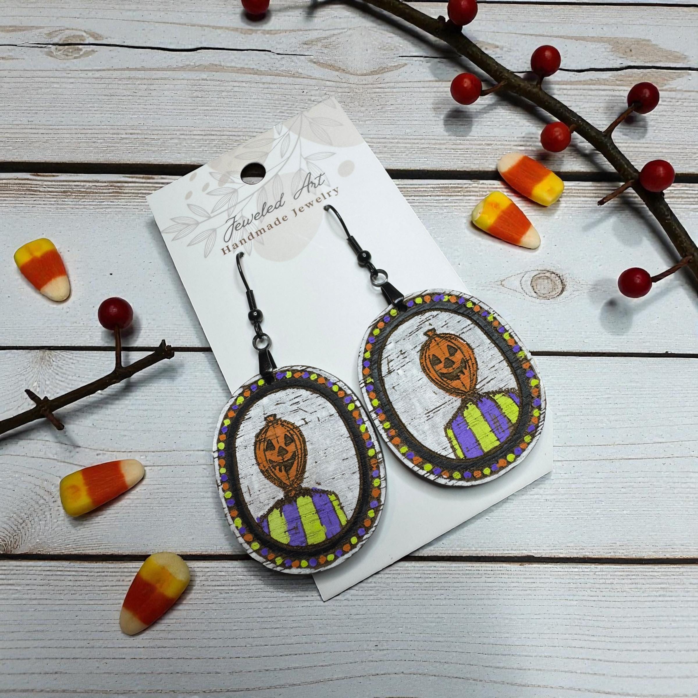 These Halloween statement earrings feature a unique pumpkin-headed ghost character hand-painted in vibrant orange, purple, and green. Each oval frame is accented with a festive dotted border, giving the design a vintage portrait vibe. Lightweight yet bold, these earrings are the perfect finishing touch for haunted hayrides, trick-or-treat nights, or pumpkin patch outings.